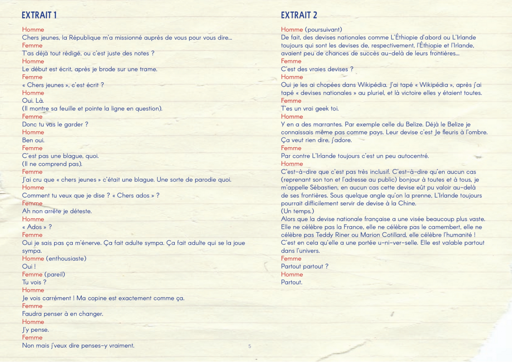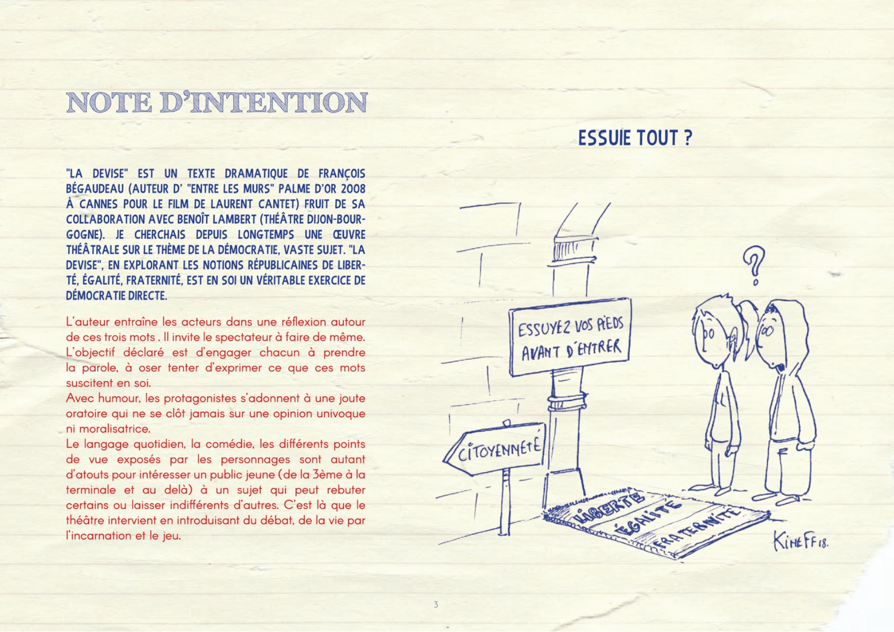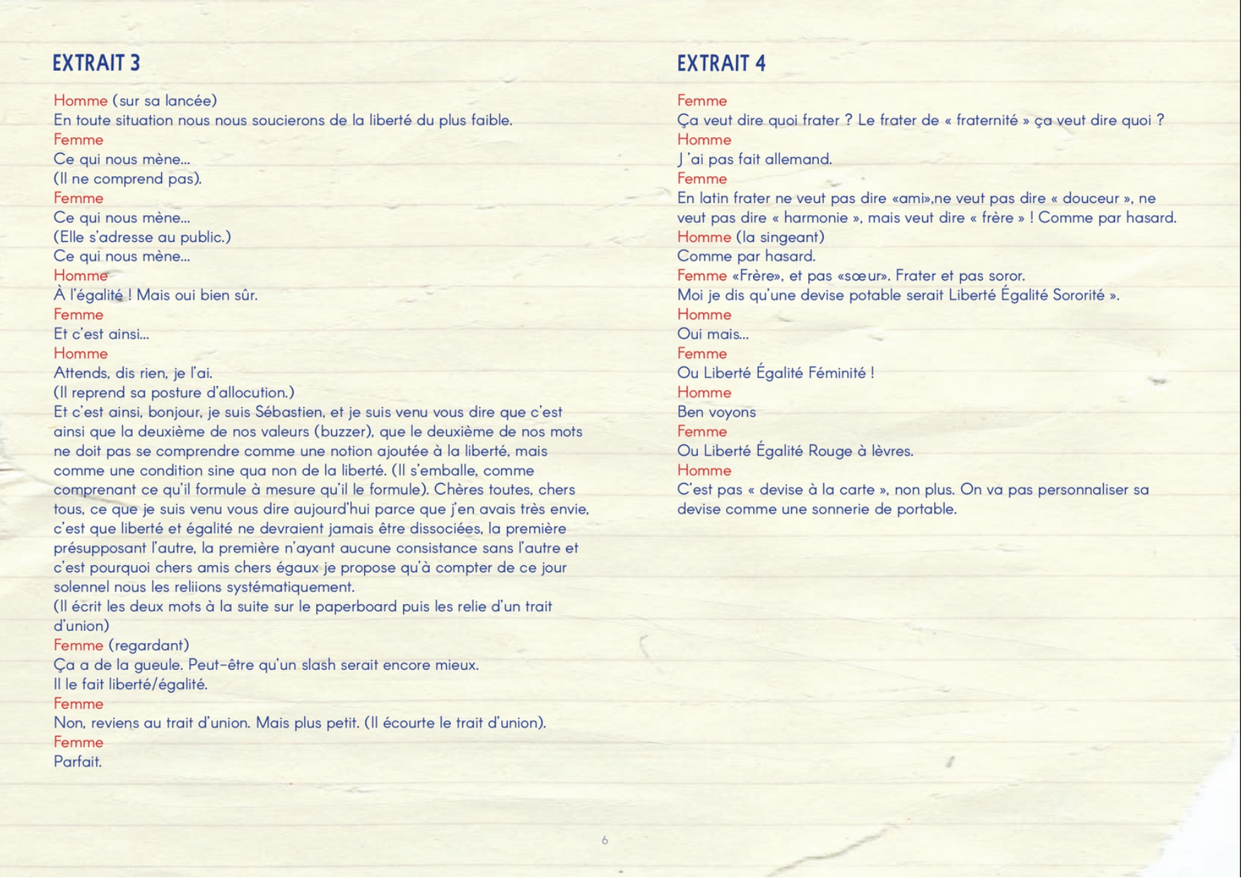François Begaudeau, auteur de « Entre les murs », palme d’or au festival de Cannes en 2008, nous entraîne dans une réflexion jubilatoire sur les trois mots de la devise. Avec humour, il utilise un langage quotidien pour pouvoir intéresser un public jeune et toucher « ceux qui se mettent dans le fond ».