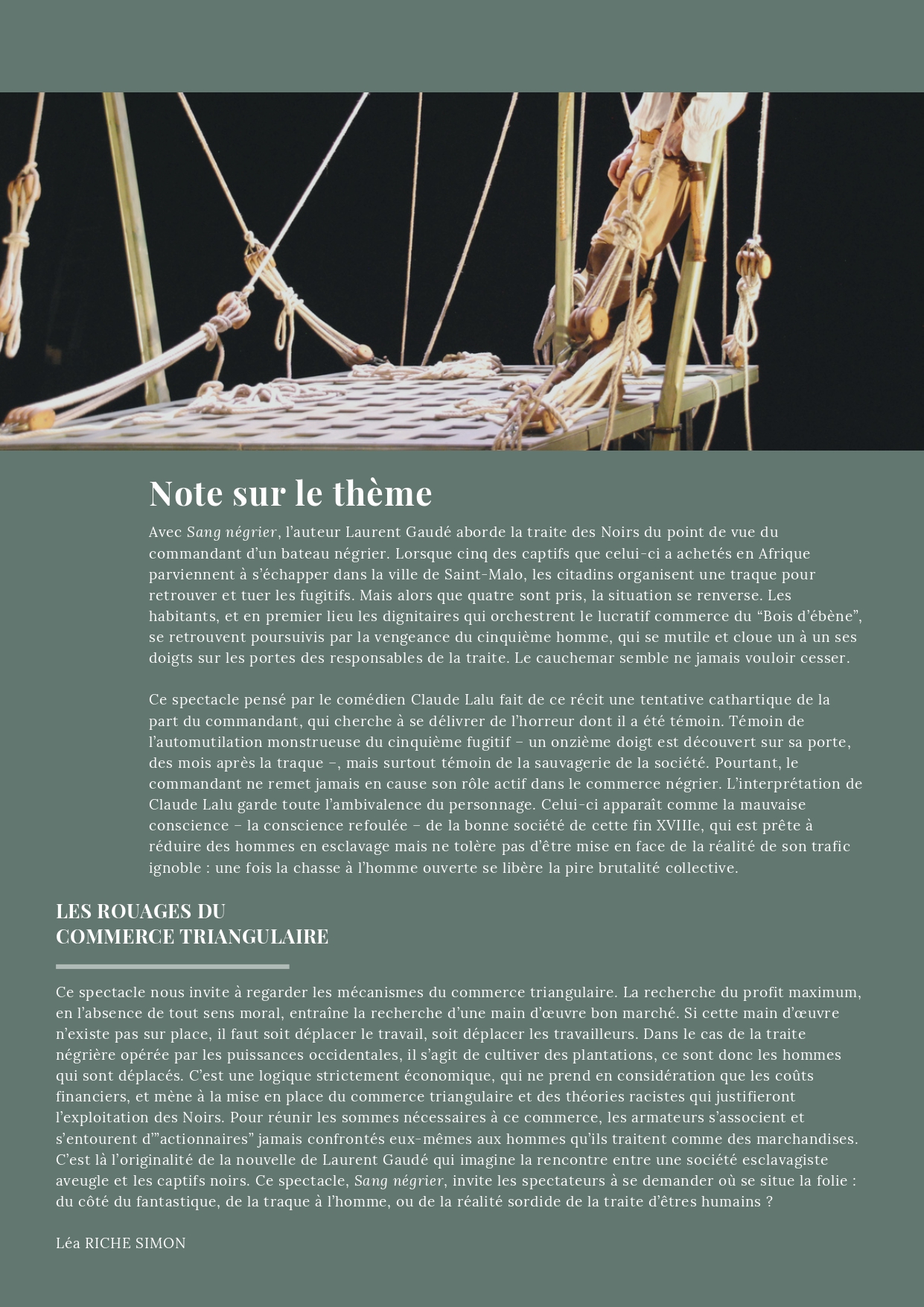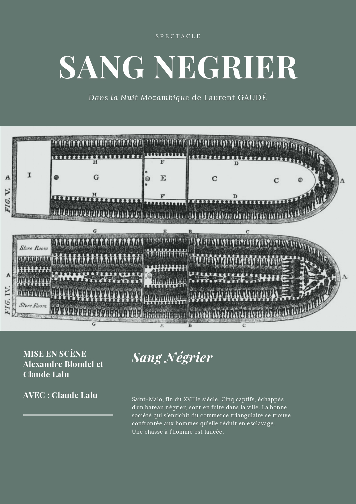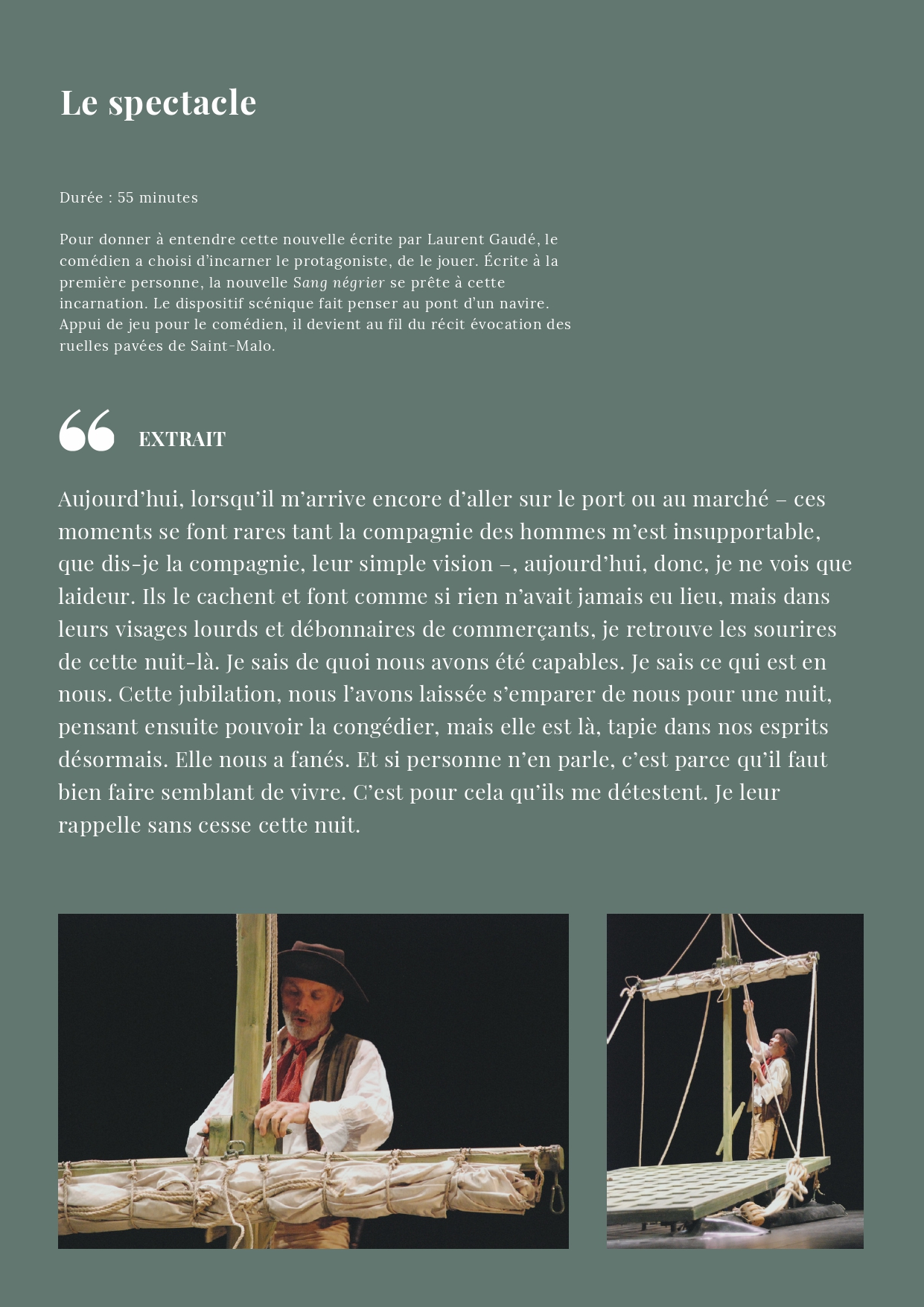 Écrite à la première personne, la nouvelle Sang négrier se prête à cette incarnation. Le dispositif scénique fait penser au pont d’un navire. Appui de jeu pour le comédien, il devient au fil du récit évocation des ruelles pavées de Saint-Malo. Cette forme a l’avantage de pouvoir être donnée au sein des établissements scolaires.