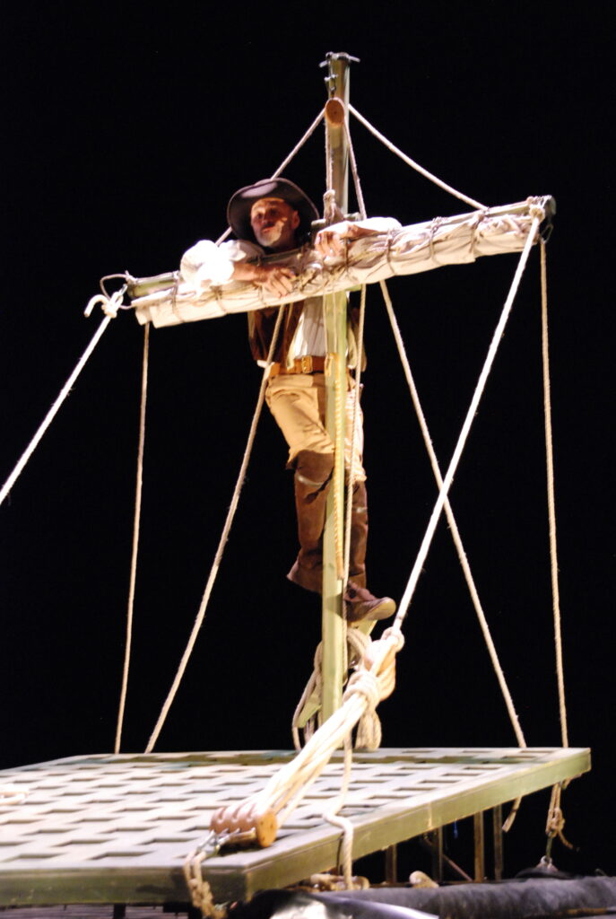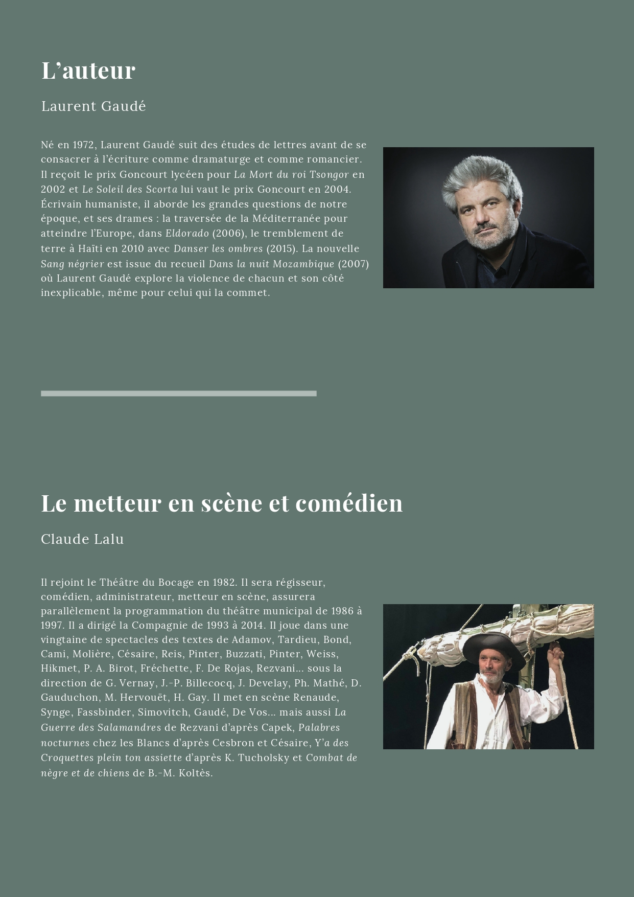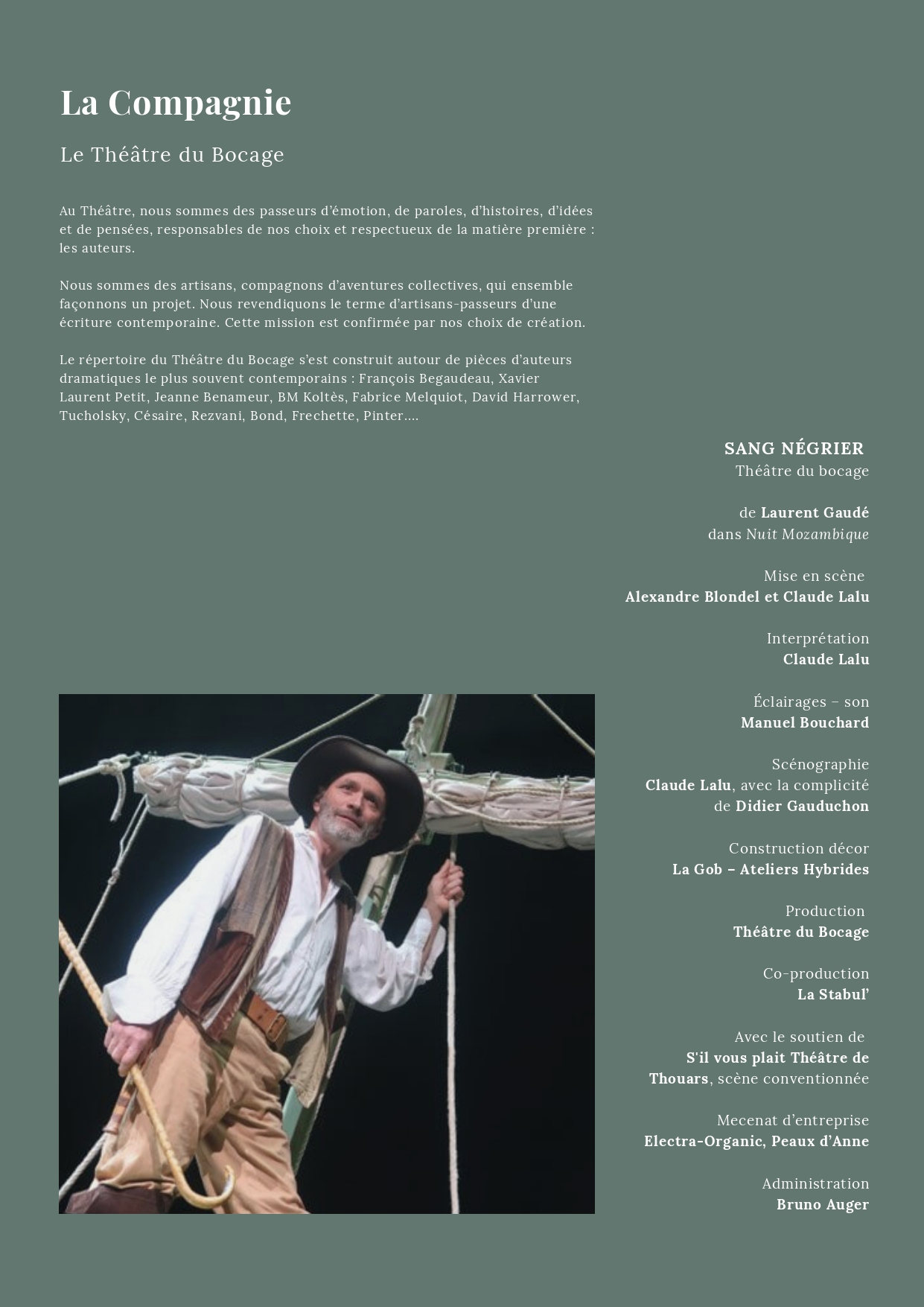 Écrite à la première personne, la nouvelle Sang négrier se prête à cette incarnation. Le dispositif scénique fait penser au pont d’un navire. Appui de jeu pour le comédien, il devient au fil du récit évocation des ruelles pavées de Saint-Malo. Cette forme a l’avantage de pouvoir être donnée au sein des établissements scolaires.